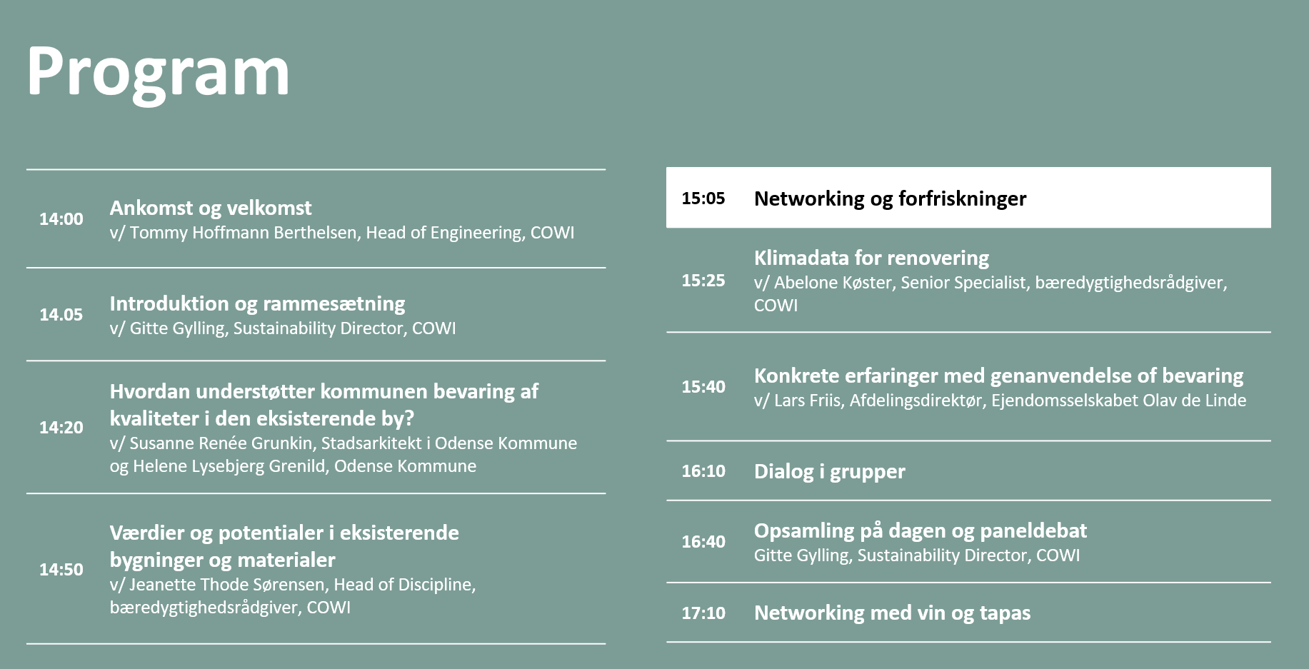 Dette – og meget mere – vil være omdrejningspunktet, når COWI og Arkitema inviterer til et eksklusivt og tværfagligt dialogmøde i Odense om bevaring af den eksisterende bygningsmasse. Vi ønsker at sætte fokus på, hvordan arbejdet med den eksisterende bygningsmasse gribes an fra et myndigheds- og developerperspektiv, og hvordan selektiv nedrivning kan skabe værdi på projekterne.